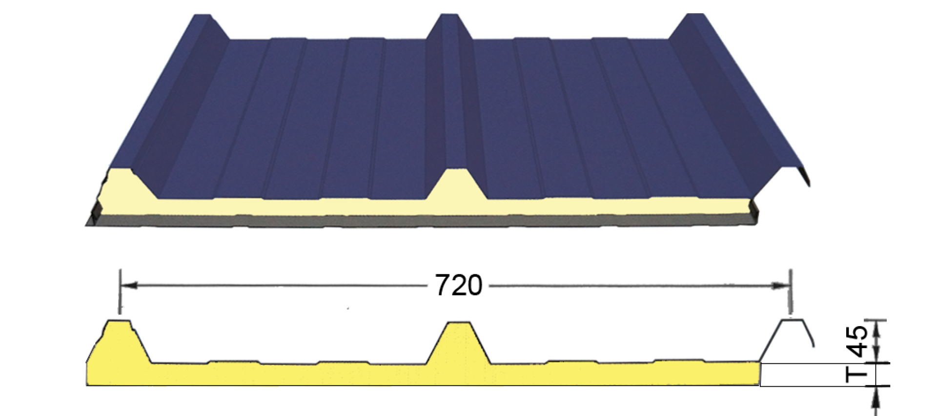 - ความกว้างของลอนหลังคาหลังจากหักระยะซ้อนทับแล้วเท่ากับ 720 มม. ความสูงลอน 45 มม.