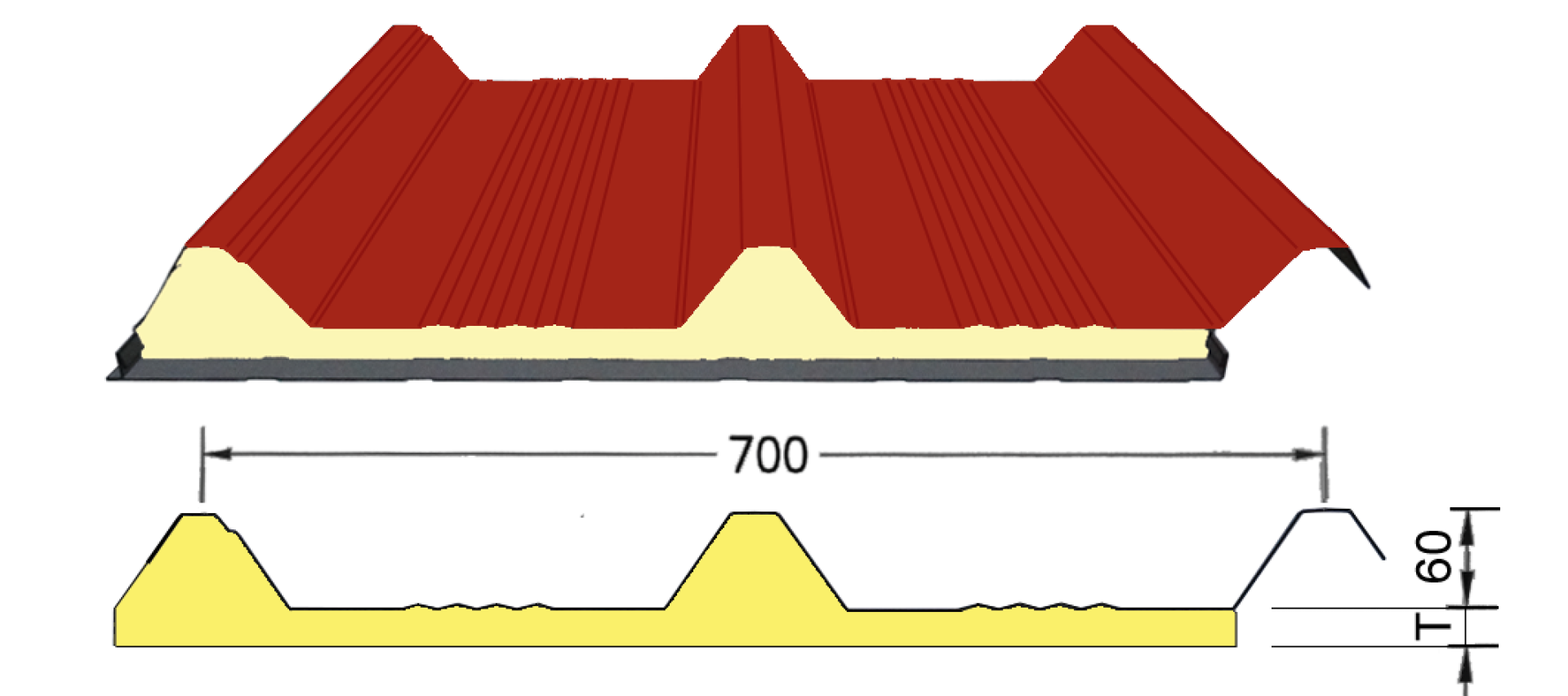 - ความกว้างของลอนหลังคาหลังจากหักระยะซ้อนทับแล้วเท่ากับ 700 มม. ความสูงลอน 60 มม.